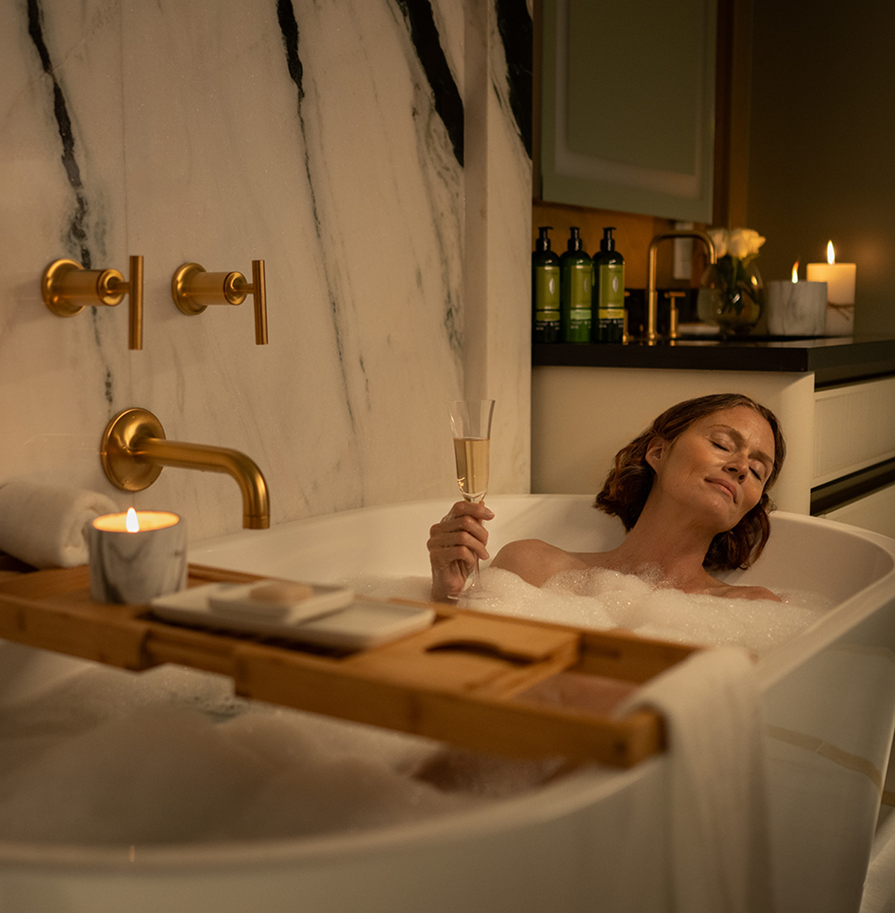 – Bubble bath tray, with rose petals and tea light candles set up by the deep soaking tub